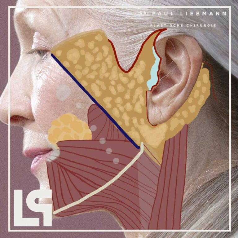 Das Gesicht kann in verschiedene Ebenen unterteilt werden. Die tiefste Schicht ist die Muskelschicht. Darüber liegt die Schicht, die mit den Muskeln verbunden ist. Wir haben also die Haut als oberste Schicht. Darunter haben wir eine Schicht, die SMAS genannt wird und mit den Muskeln des Gesichts verbunden ist.
